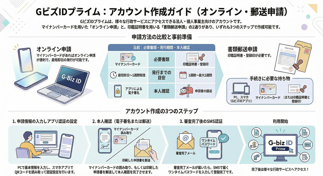 法人代表者のマイナンバーカード、パソコン、スマートフォンを用意し、「GビズIDアプリ」をインストールします 。